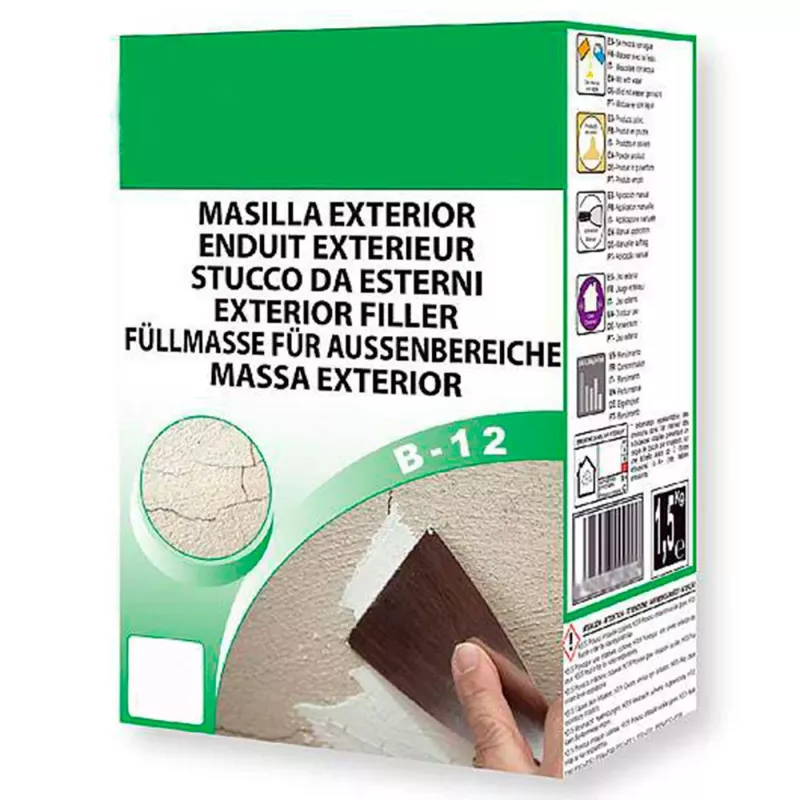 Tradineur - Masilla para exterior en polvo B-12 es la solución ideal para retapar grietas, reparar fachadas y trabajos de albañilería en superficies exteriores. Formulada especialmente para resistir las inclemencias del clima, esta masilla de alta calidad garantiza un acabado duradero y resistente, permitiendo que tus reparaciones se mantengan intactas por mucho más tiempo.