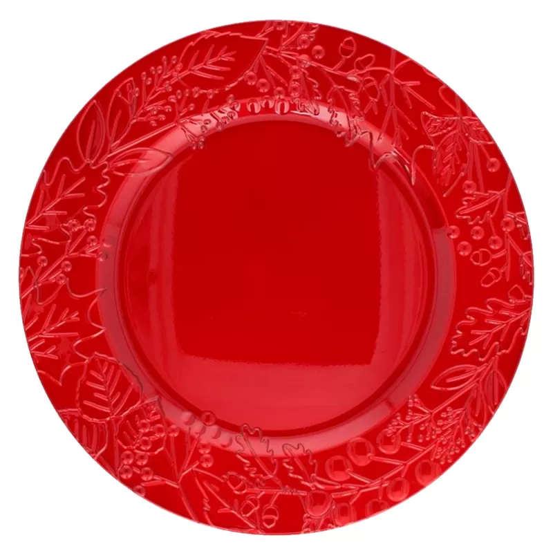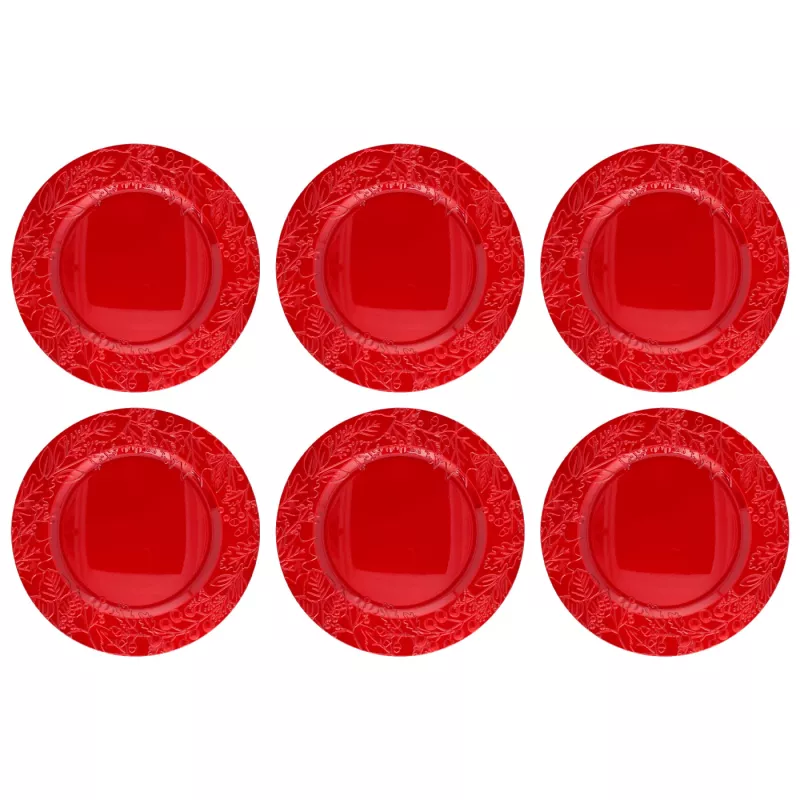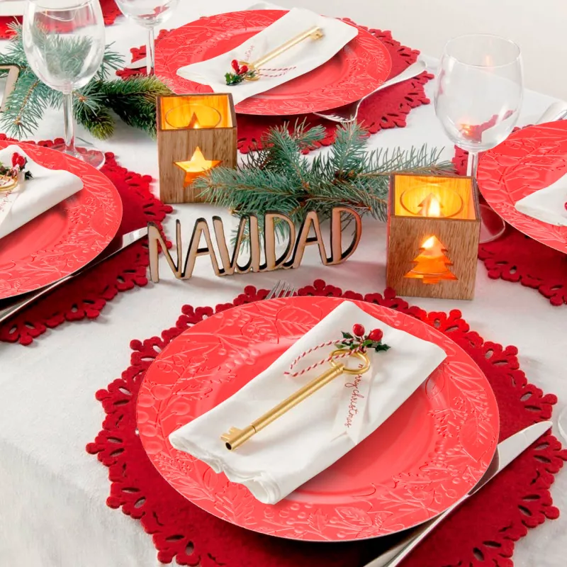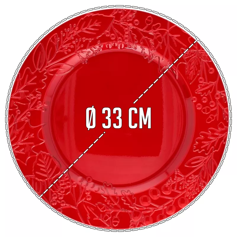 Fabricado en plástico resistente, este bajoplato es ligero, duradero y fácil de limpiar, lo que lo convierte en una opción práctica sin perder la estética navideña. Su acabado detallado en color rojo brillante resalta en la decoración, brindando un ambiente cálido y acogedor durante las fiestas. Perfecto para quienes desean dar un aire especial a su mesa, este accesorio es tanto funcional como decorativo. El pack incluye 6 unidades.