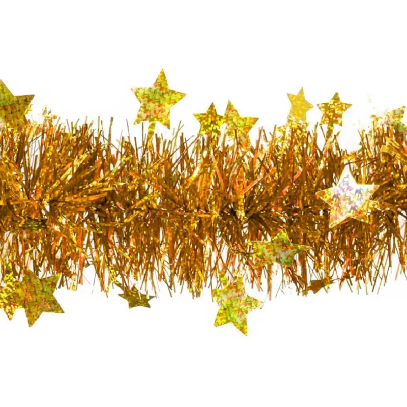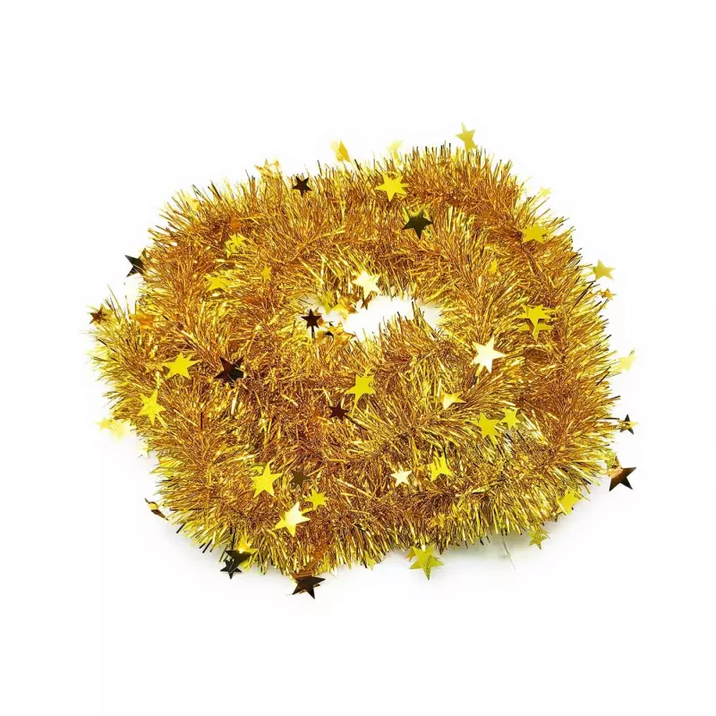 Fabricada con espumillón brillante de alta calidad y adornada con oropel colgante, esta guirnalda no solo captura la esencia festiva de la temporada, sino que también añade un brillo sofisticado que realza cualquier ambiente. Su color dorado cálido combina a la perfección con decoraciones clásicas y modernas, creando un efecto visual armonioso y encantador.