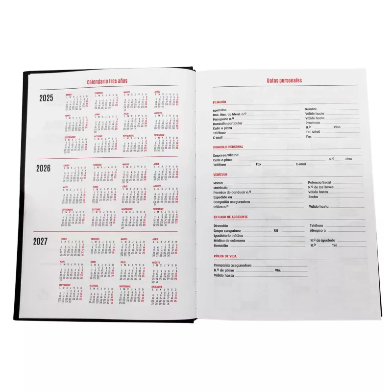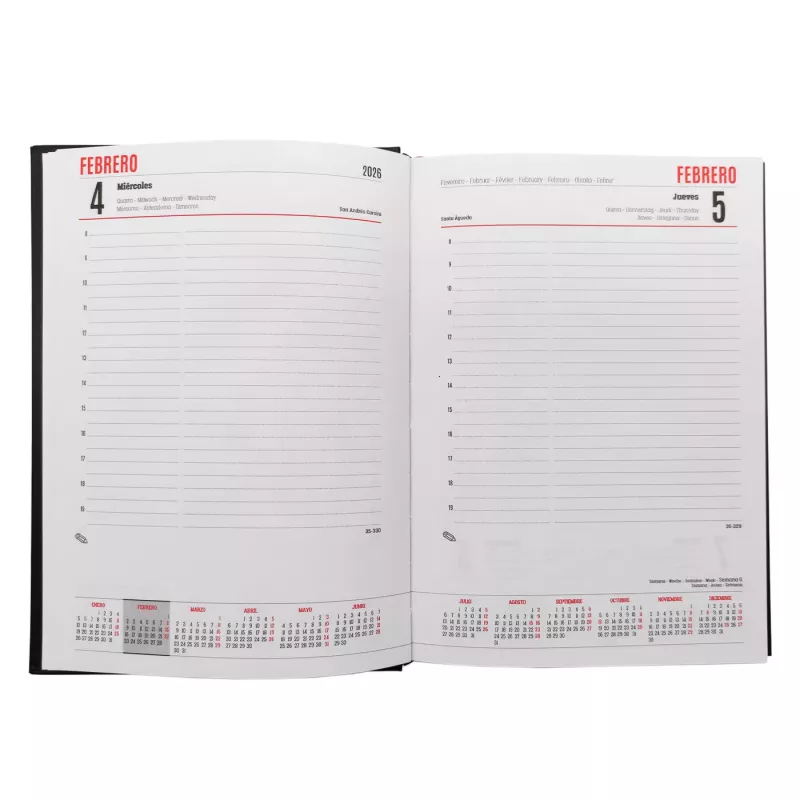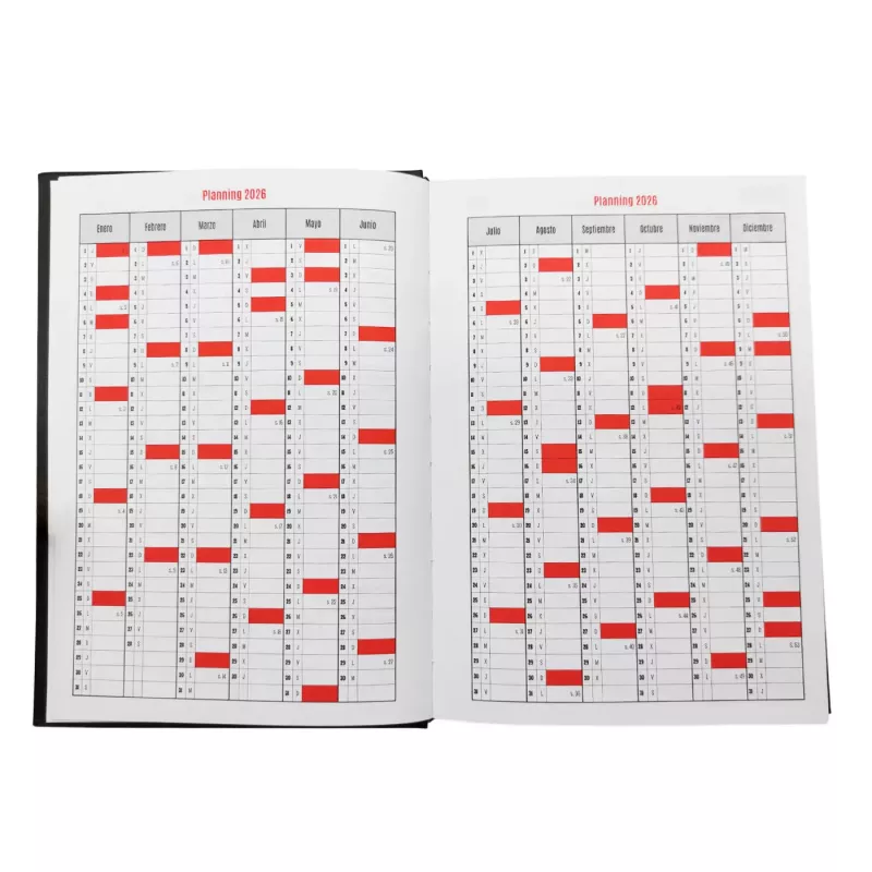 La agenda cuenta con una tapa dura de elegante color rojo que protege tus apuntes y garantiza su durabilidad durante todo el año. Además, incorpora una práctica cinta marcapáginas para que puedas acceder rápidamente a la fecha actual o a cualquier nota importante que desees destacar. Su formato diario te permite planificar cada jornada en detalle, facilitando el seguimiento de tus actividades y compromisos.