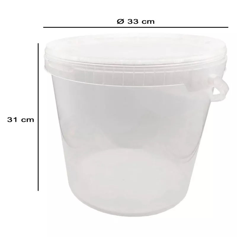 El producto está fabricado en plástico polipropileno (PP) de alta calidad, lo que garantiza su durabilidad y seguridad. Es reutilizable, reciclable y completamente apto para uso alimentario, por lo que puedes confiar en su integridad al almacenar tus comestibles. Las dimensiones del cubo son de aproximadamente 31 x 33 cm (altura x diámetro), permitiéndote aprovechar al máximo su capacidad.
