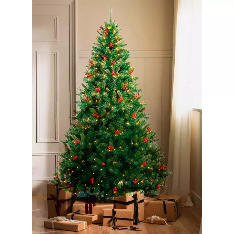 El árbol incluye 400 luces LED de color cálido, que proporcionan un brillo acogedor y uniforme, resaltando la belleza del follaje y creando un ambiente navideño mágico. Es ideal para decorar con adornos, guirnaldas y estrellas, convirtiéndose en el centro de atención de la decoración navideña y ofreciendo durabilidad y facilidad de montaje para disfrutar de la temporada con estilo y confort.