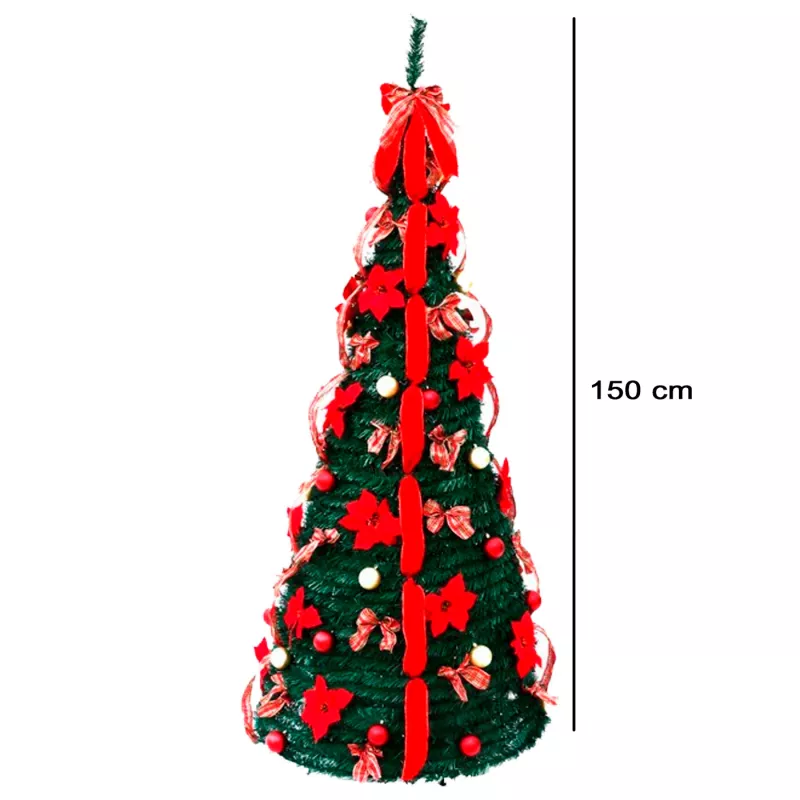 Este árbol de Navidad plegable Tradineur es una opción práctica y elegante para decorar el hogar en las fiestas. Su diseño viene predecorado con flores rojas, cintas doradas, bolas rojas y blancas, logrando un estilo clásico y festivo que aporta calidez al ambiente. En la punta del árbol destaca un gran lazo decorativo, cuyos extremos caen hasta la base, dando un toque llamativo y armonioso a toda la estructura.