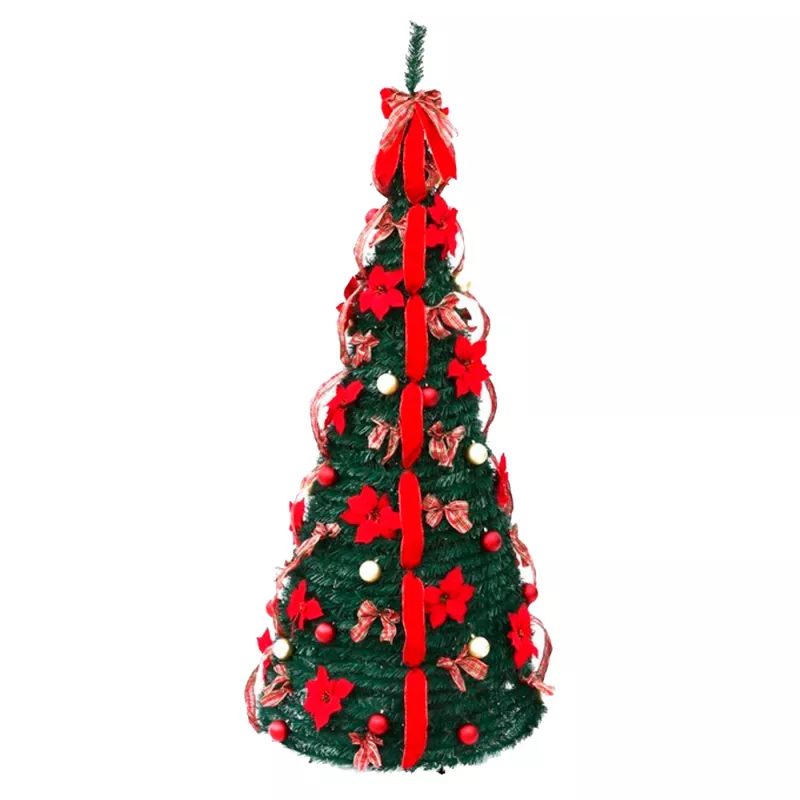 Este árbol de Navidad plegable Tradineur es una opción práctica y elegante para decorar el hogar en las fiestas. Su diseño viene predecorado con flores rojas, cintas doradas, bolas rojas y blancas, logrando un estilo clásico y festivo que aporta calidez al ambiente. En la punta del árbol destaca un gran lazo decorativo, cuyos extremos caen hasta la base, dando un toque llamativo y armonioso a toda la estructura.