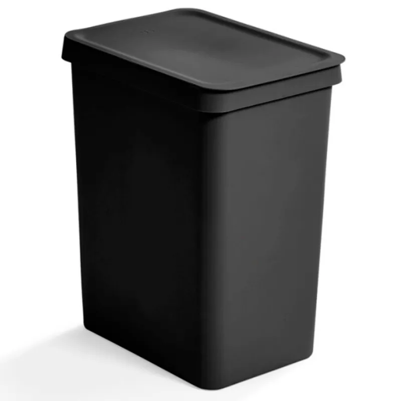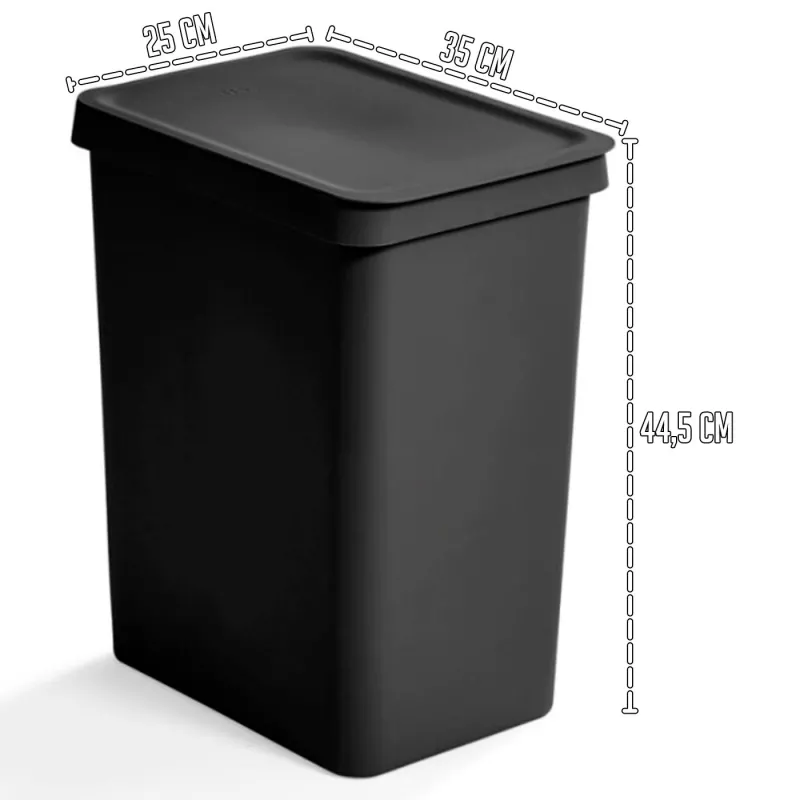 Con unas medidas de 44,5 x 35 x 25 cm, su diseño compacto permite colocarlo en espacios reducidos sin sacrificar capacidad, mientras que su tapa facilita la retención de olores y mantiene el área libre de suciedad visible. Su diseño en color negro se integra fácilmente con diferentes estilos de decoración.
