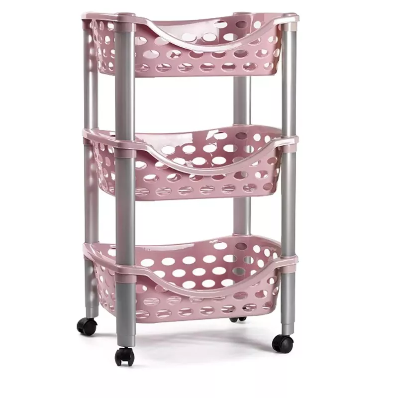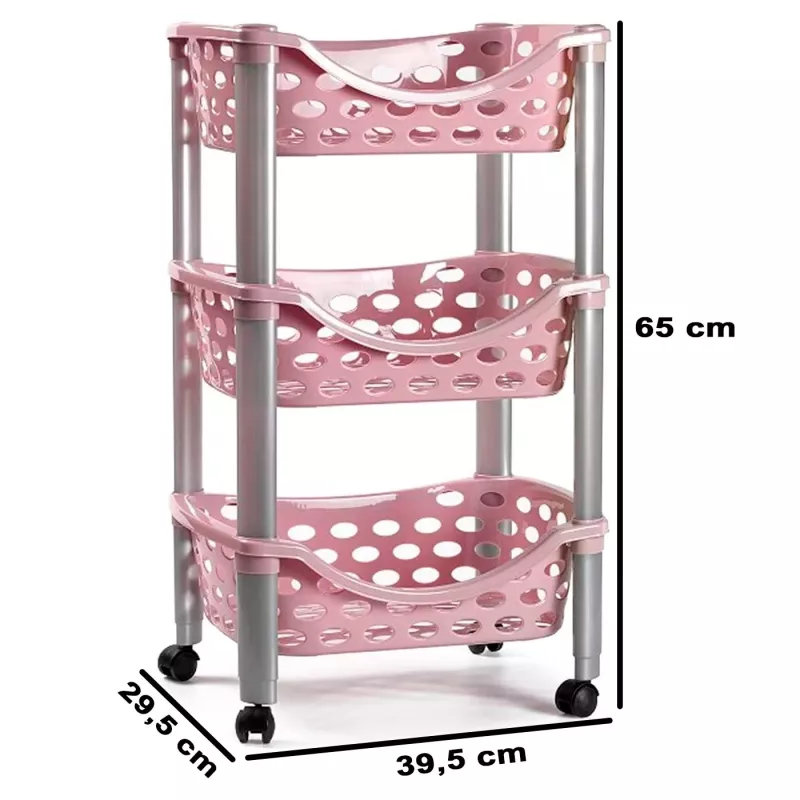 Fabricado en plástico duradero y ligero, el carrito presenta un atractivo color rosa combinado con patas grises que aportan un toque moderno y sofisticado. Sus cestas apilables permiten maximizar el uso del espacio, facilitando la organización eficiente sin ocupar mucho lugar. Con unas dimensiones de 65 x 39,5 x 29,5 cm, este carrito es compacto pero con gran capacidad, adaptándose perfectamente a cualquier ambiente.