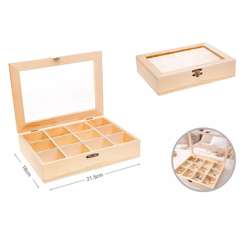 Fabricada en madera natural sin tratar, la caja es la opción perfecta para quienes disfrutan de las manualidades. Puedes barnizarla o decorarla al gusto, personalizándola para que se integre a la perfección en tu estilo y espacio. Las medidas aproximadas de la caja son de 21,5 x 18 x 4 cm, y cada uno de los compartimentos mide alrededor de 4,7 x 5,2 x 3,2 cm, lo que proporciona un espacio ideal para almacenar y exhibir tus piezas más queridas.