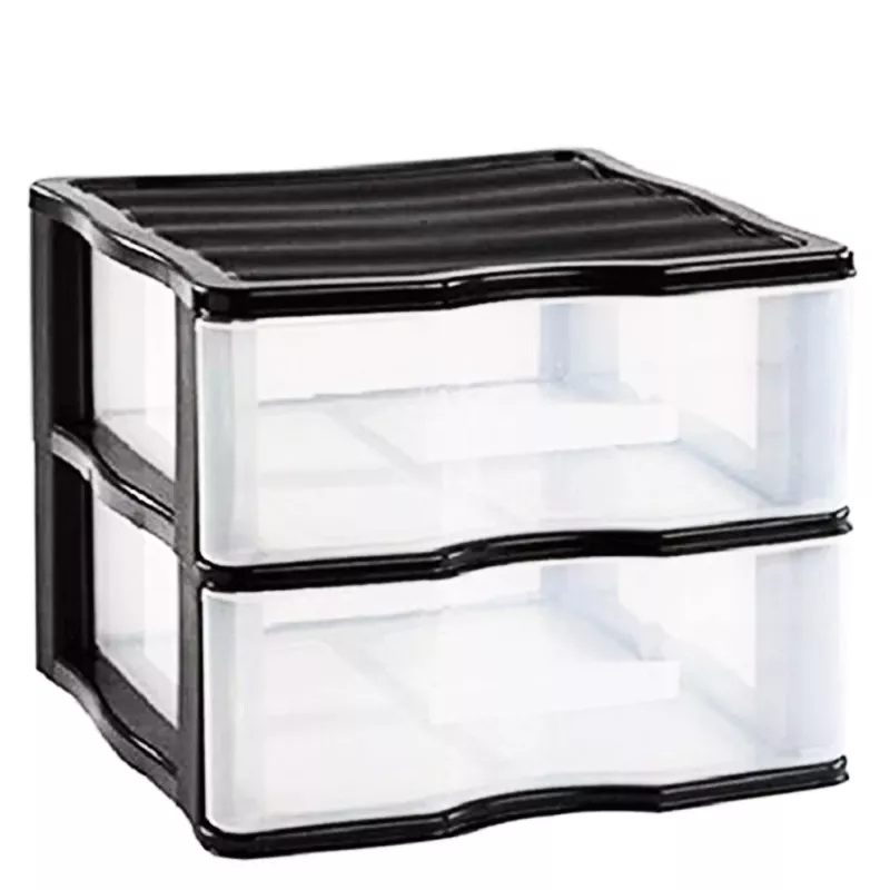 Organiza tu espacio de trabajo o tu hogar con la práctica cajonera Wagon de plástico negro. Este contenedor de plástico cuenta con dos cajones transparentes que facilitan la visualización rápida de su contenido, ideal para mantener en orden folios, documentos y otros utensilios esenciales. Con unas dimensiones compactas de 32,5 x 36,5 x 38 cm, se adapta perfectamente a escritorios, estanterías y rincones reducidos, optimizando tu superficie sin sacrificar capacidad.