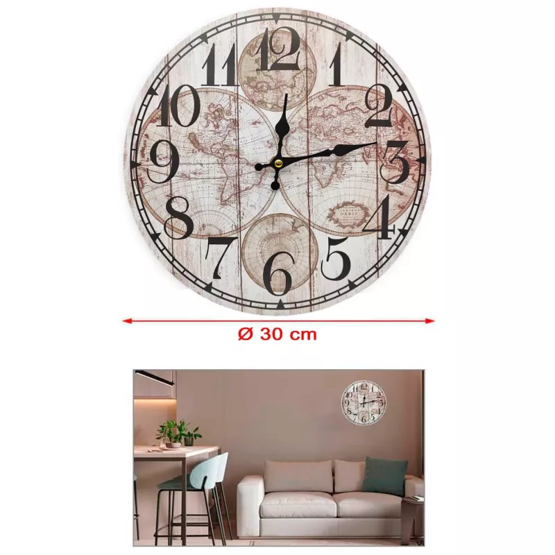 Decora cualquier estancia de tu hogar o negocio con este bonito reloj de pared redondo modelo Globos Terráqueos. Cuenta con unos números grandes que se verán bien desde lejos y lo que es más importante: ¡es silencioso!, así que olvídate de los molestos ruidos que suelen provocar este tipo de relojes de agujas.