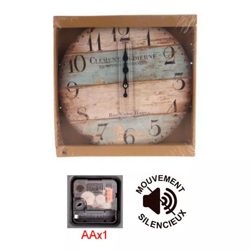 El reloj funciona con una pila AA (no incluida), cuenta con agujas metálicas y la estructura es de madera MDF resistente y de alta calidad. Mide aproximadamente 30 x 0,5 cm (diámetro x grosor). Perfecto para colocar en cocinas, salones, dormitorios, bares o cafeterías.