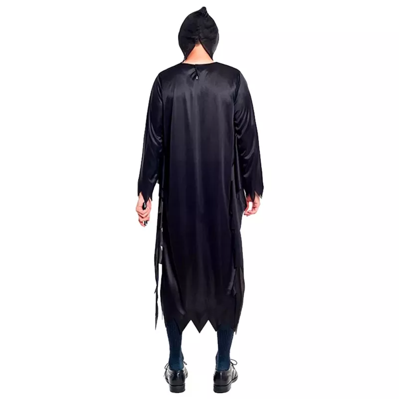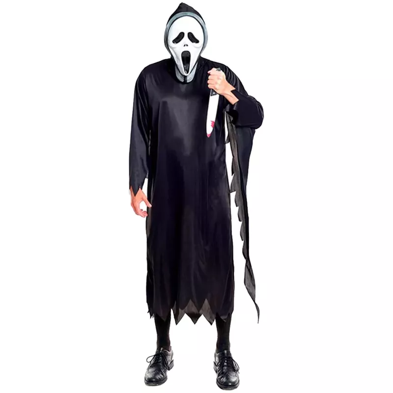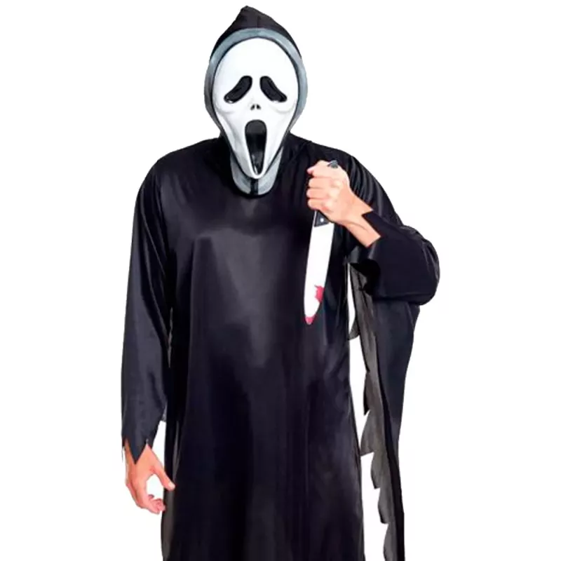 El set incluye una túnica negra larga con capucha y detalles característicos, diseñada para ofrecer un ajuste cómodo y libertad de movimiento. La máscara icónica del asesino Scream completa el look aterrador, confeccionada con materiales resistentes y ligeros que facilitan su uso durante horas. Disponible en talla S para hombre, este disfraz es ideal para quienes desean un atuendo auténtico y escalofriante.