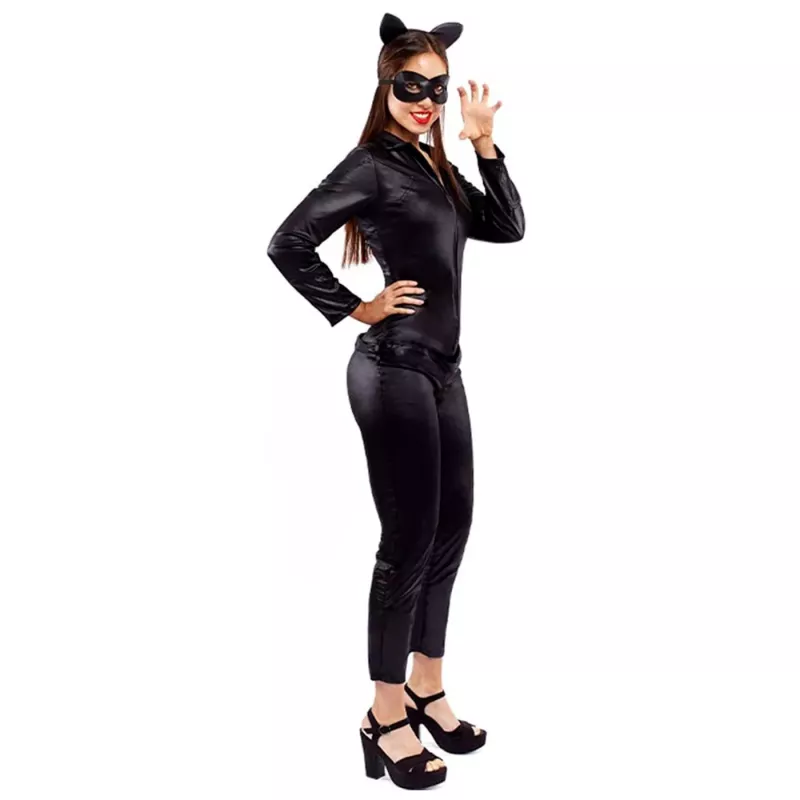 Fabricado en poliéster de alta calidad, el disfraz incluye un mono ajustado que realza la figura femenina y proporciona gran libertad de movimiento. Además, viene con una diadema con orejas de gato y un antifaz a juego que complementan a la perfección el atuendo, logrando un look auténtico y seductor de Catwoman.