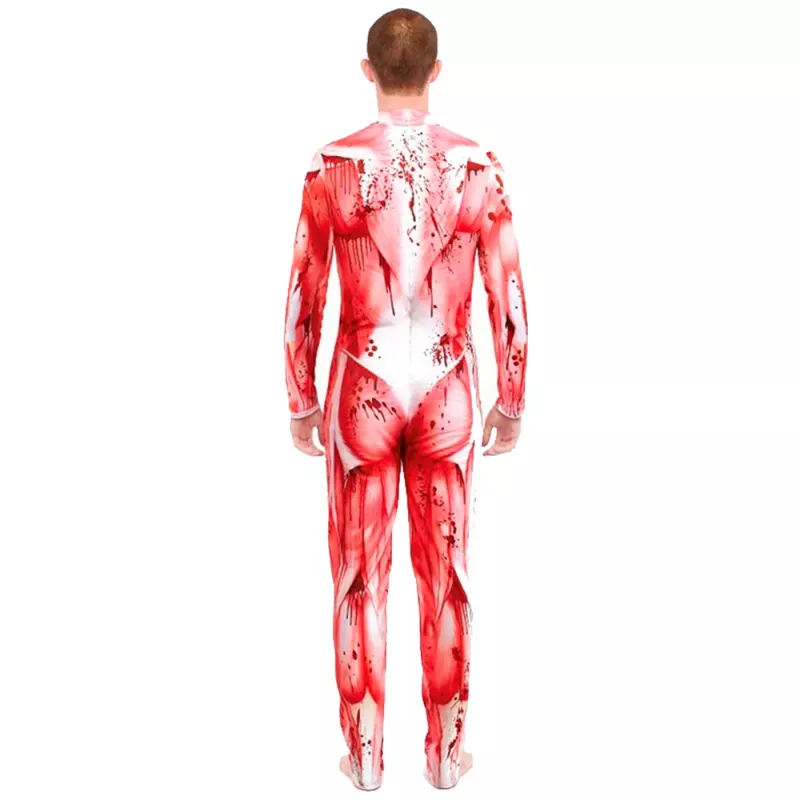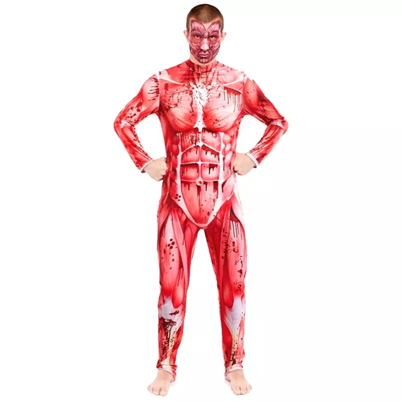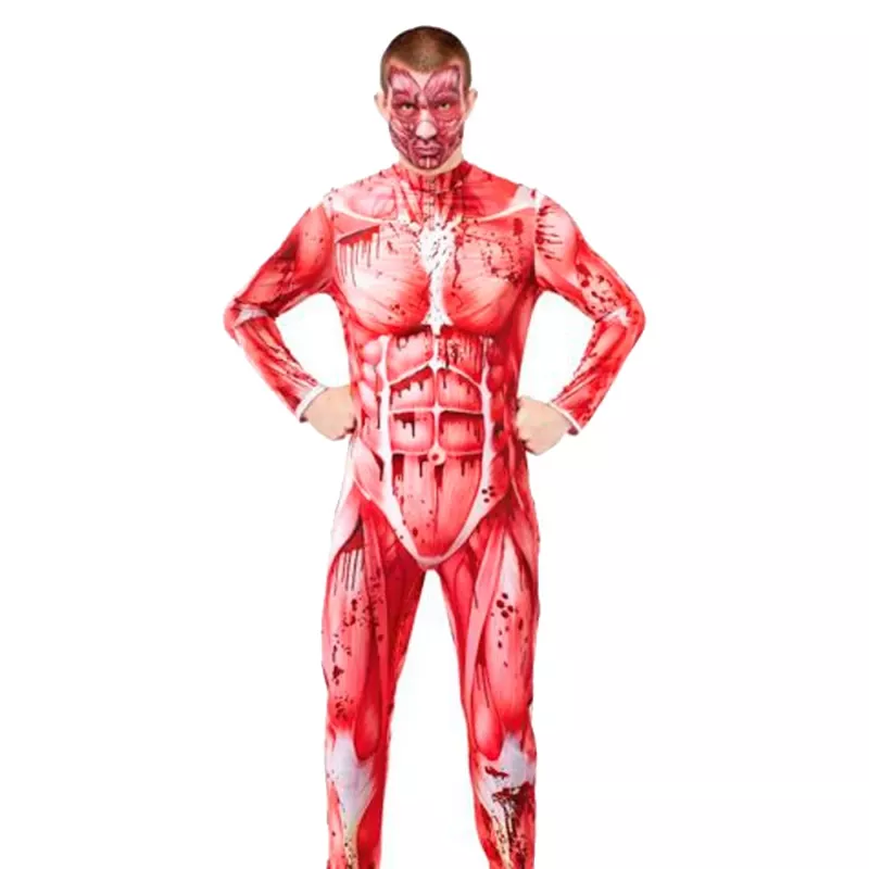 Fabricado en poliéster de alta calidad, el disfraz es cómodo, resistente y fácil de llevar durante largas horas. Incluye un mono completo que cubre el cuerpo, reproduciendo músculos sangrientos con un acabado detallado que simula heridas y sangre fresca, creando una apariencia terrorífica pero llamativa. La talla S está adaptada para adultos que buscan un ajuste ceñido y cómodo, asegurando libertad de movimiento y estilo.
