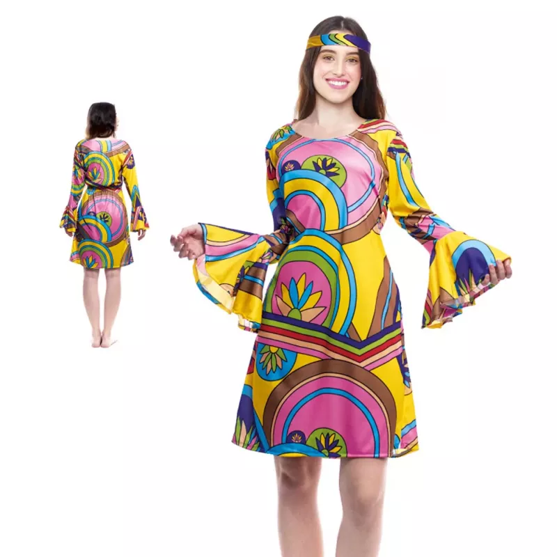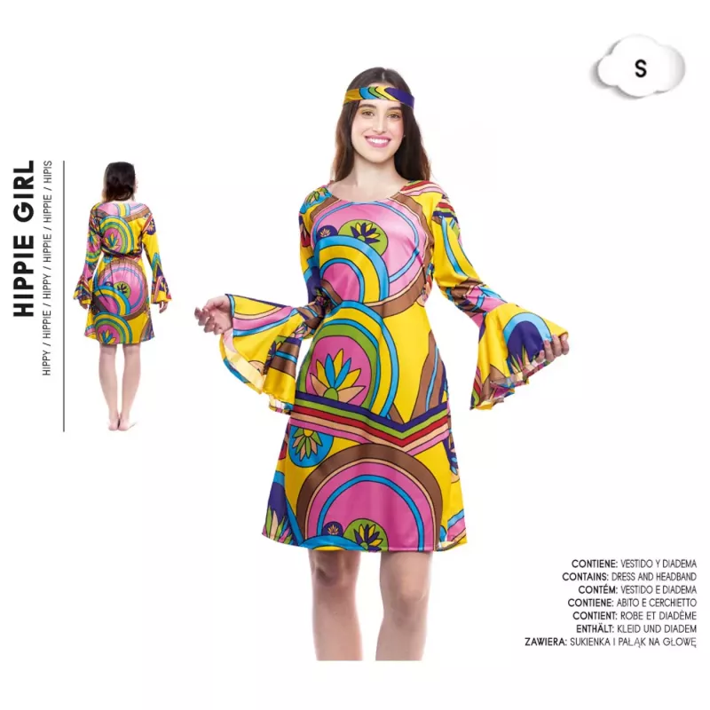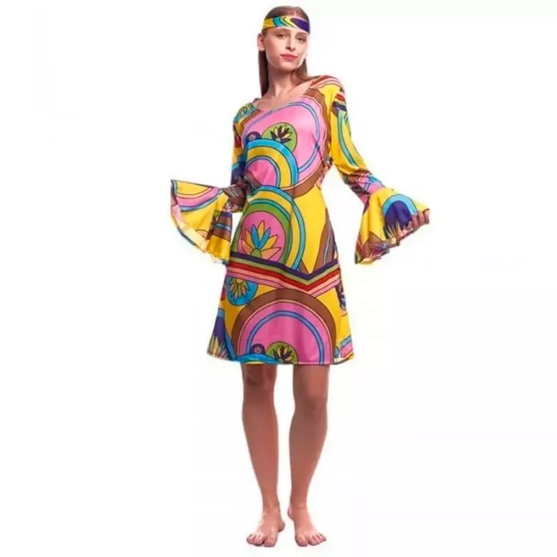 El vestido presenta un diseño auténtico con estampados psicodélicos y detalles que evocan el espíritu bohemio y alegre de la época hippie. La diadema, con sus flores características, completa el look para que luzcas impactante y auténtica. Disponible en talla S, este disfraz está pensado para mujeres que desean destacar con estilo y originalidad.
