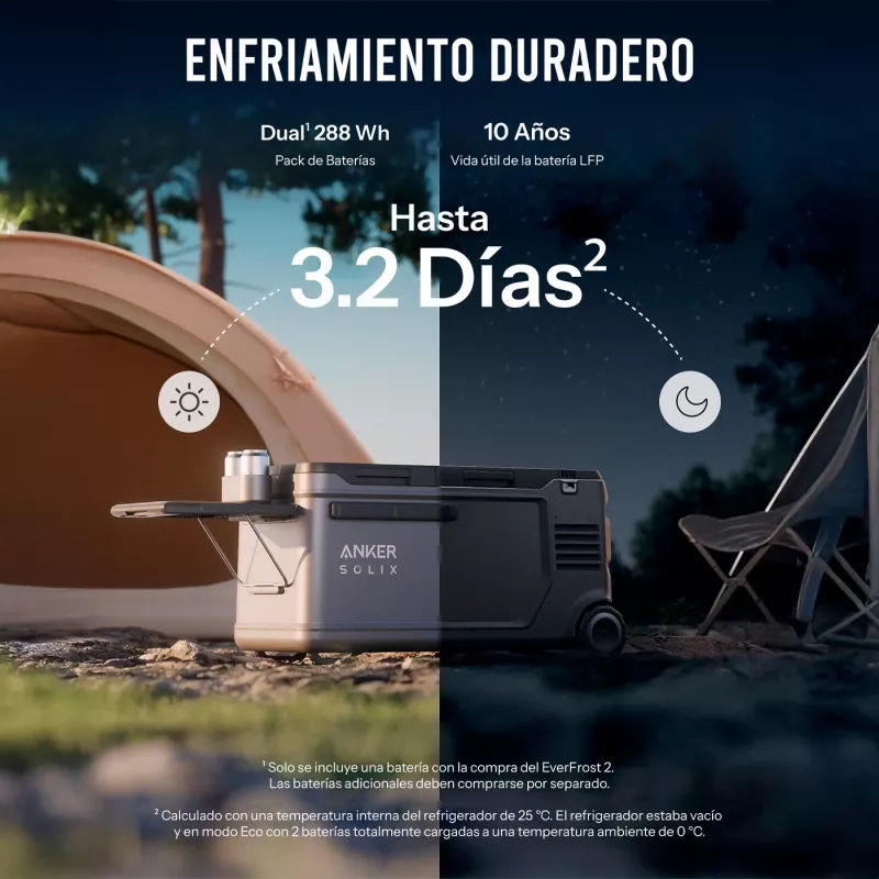 La Anker SOLIX Everfrost 2 de 58 L es una nevera eléctrica portátil de doble compartimento diseñada para mantener tus alimentos y bebidas frescos durante aventuras al aire libre, viajes de fin de semana o situaciones sin acceso a la red eléctrica. Gracias a sus 2 baterías de 288 Wh, puede ofrecer hasta 3,2 días de enfriamiento duradero, y la recarga se realiza mediante panel solar, toma de automóvil, enchufe de pared o USB-C, brindando flexibilidad total en cualquier entorno.