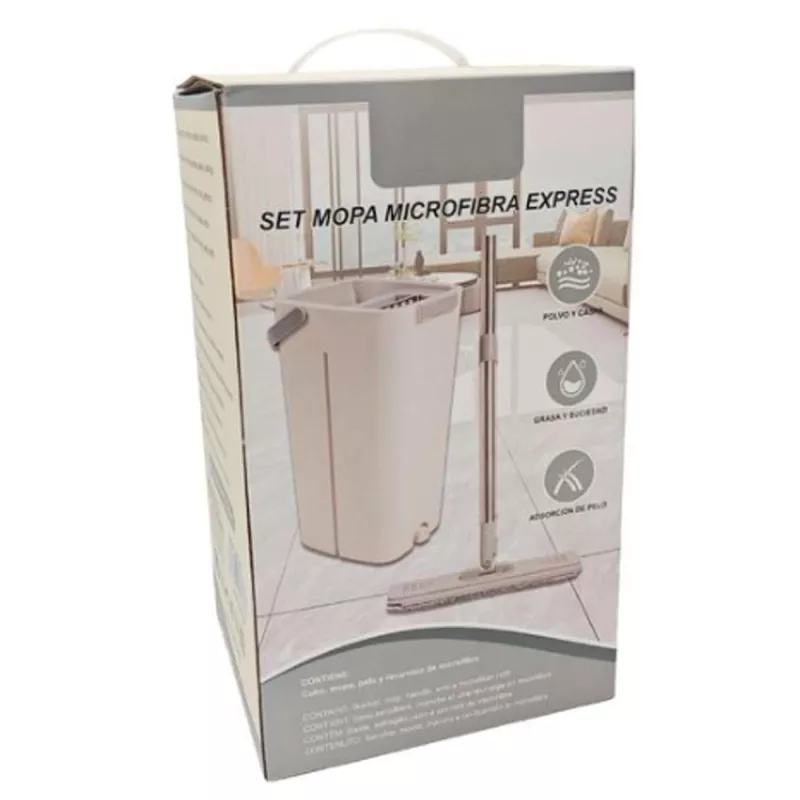 La mopa de microfibra 100% combina un diseño innovador con un giro de 180°, lo que permite limpiar todo tipo de superficies de forma más rápida y sencilla. Gracias a su alta capacidad de absorción, podrás quitar manchas y suciedad sin esfuerzo. El cubo incluye dos compartimentos para una doble función, ya que permite sumergir la mopa y escurrir el agua cuando lo necesites, haciendo que la limpieza sea aún más conveniente.