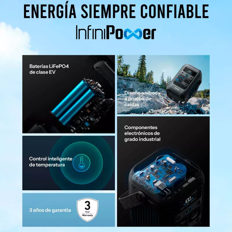 Su diseño ultraportátil, con correa integrada y un tamaño 30% más pequeño que el promedio del sector, facilita el transporte y el uso en cualquier entorno. Además, está pensada para exteriores, con una luz integrada extensible ideal para actividades nocturnas y compatibilidad con paneles solares de 100W, lo que la convierte en una fuente de energía confiable durante tus aventuras o trabajos al aire libre.