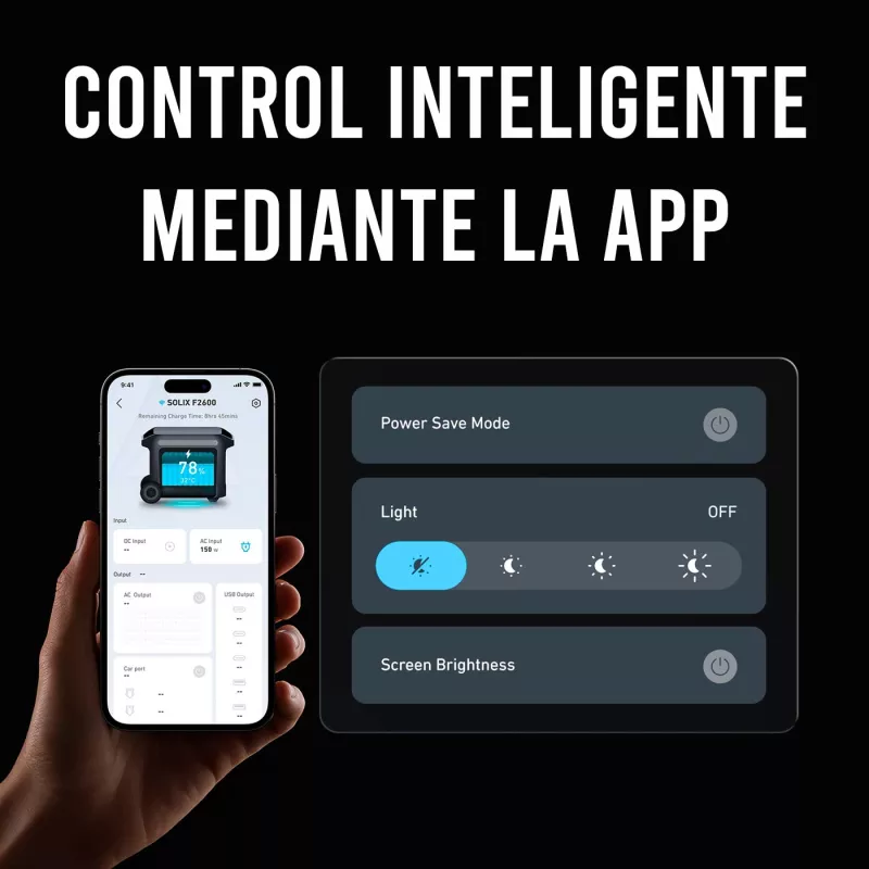 Con la app de Anker y conectividad Wi-Fi o Bluetooth, puedes controlar y personalizar tu energía, monitorear el estado de la estación, programar salidas y optimizar el uso según tus necesidades. La F2600 combina potencia masiva, recarga rápida y control inteligente, siendo ideal para cualquier situación que requiera energía confiable.