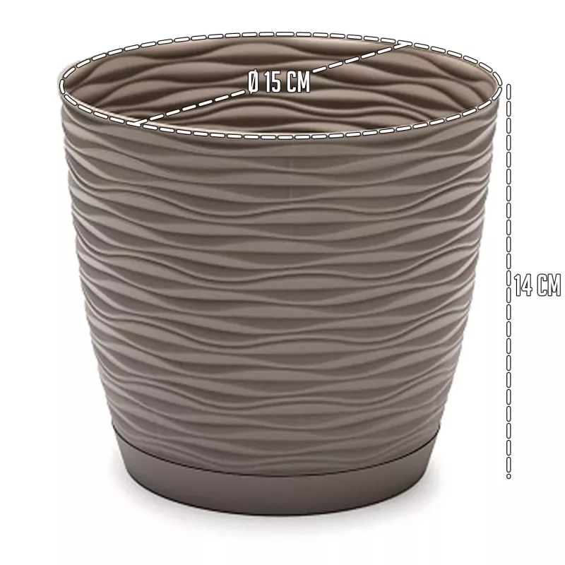El tamaño aproximado de la maceta es de Ø 15 x 14 cm (diámetro x alto), mientras que el plato inferior cuenta con unas medidas de Ø 11 x 1,5 cm (diámetro x alto), lo que las hace perfectas para una variedad de plantas, desde hierbas aromáticas hasta flores ornamentales.