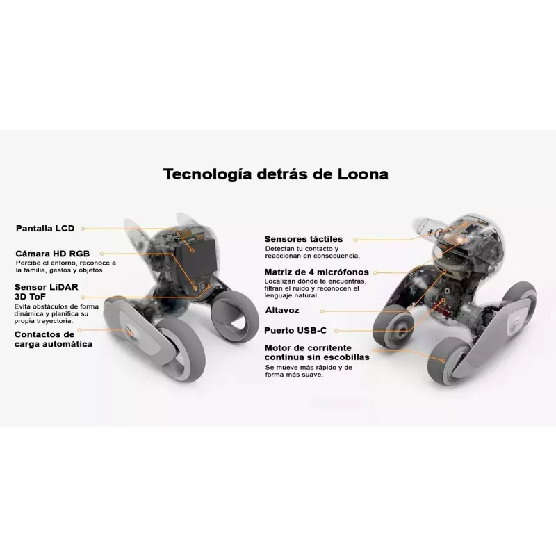 Loona revoluciona el concepto de mascota. Equipada con una cámara RGB HD, percibe y comprende tu mundo como nunca antes. Reconoce rostros, interpreta gestos, sigue comandos y juega a traer objetos, combinando el encanto de una mascota real con la tecnología más avanzada.
