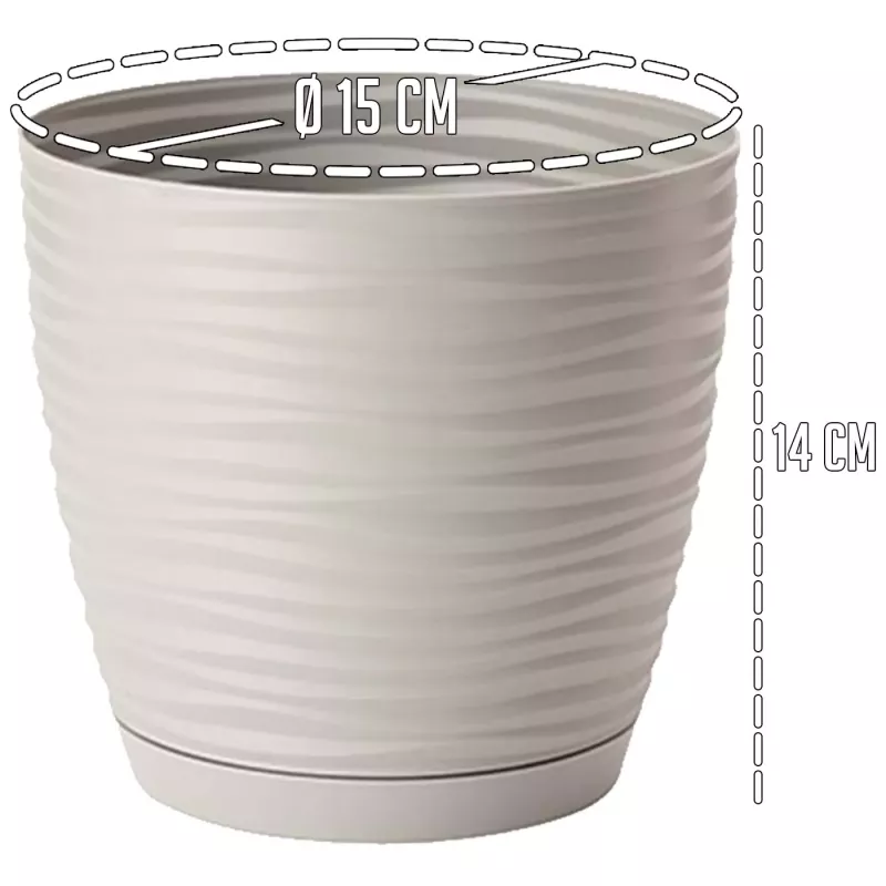 La maceta tiene un tamaño aproximado de Ø 15 x 14 cm (diámetro x alto), mientras que el plato inferior tiene un tamaño de Ø 11 x 1,5 cm (diámetro x alto). Esto la convierte en la opción ideal para una variedad de plantas, desde suculentas hasta hierbas aromáticas.