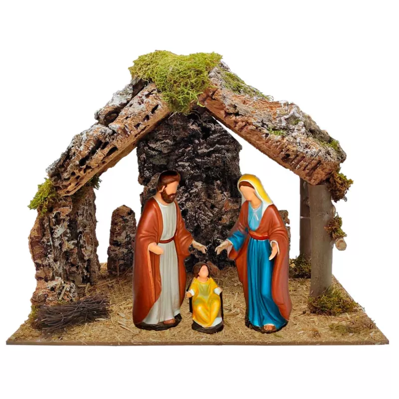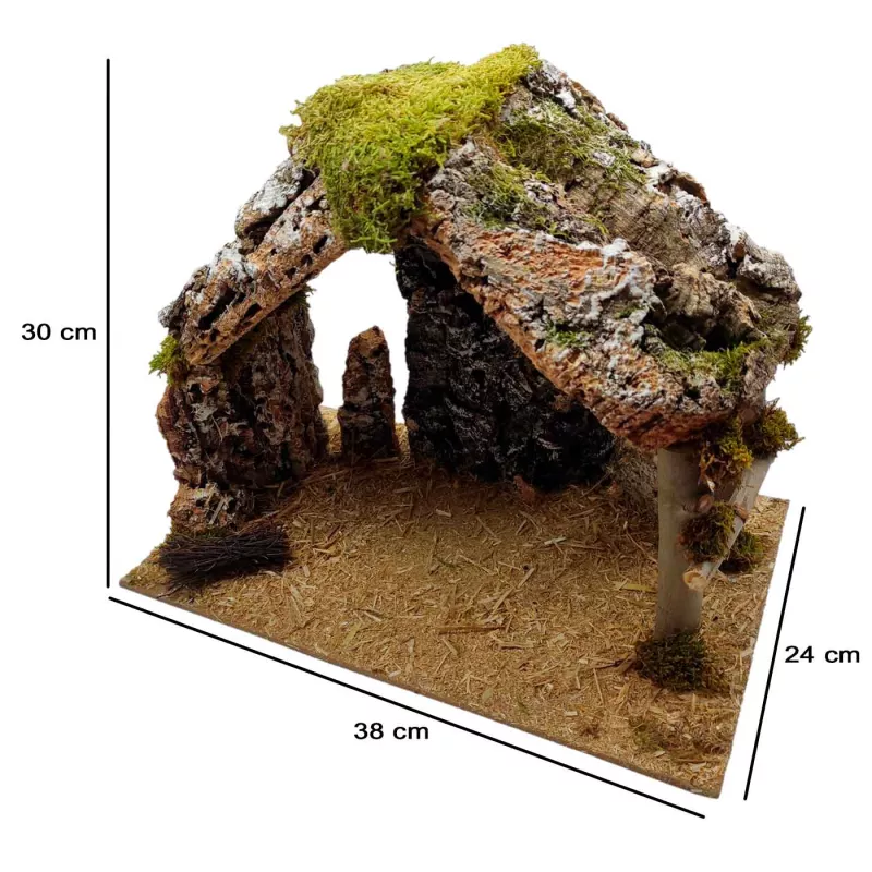 Decorada con musgo verde y vegetación, la cueva aporta frescura y naturalidad al entorno, creando un espacio armonioso para las figuras del nacimiento. Con un tamaño aproximado de 38 x 24 x 30 cm (largo x ancho x alto), es ideal para belenes medianos o grandes, convirtiéndose en un elemento central que aporta autenticidad, calidez y un toque artesanal a la escena navideña.