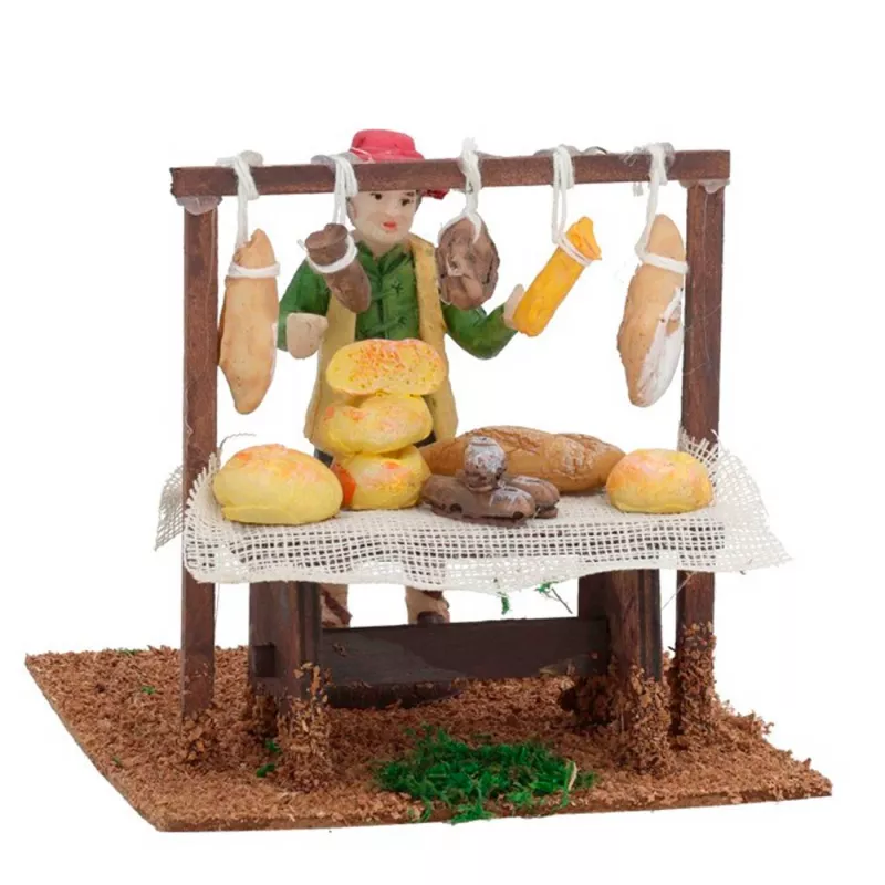 Con un tamaño aproximado de 10,5 x 12 cm, esta pieza se integra perfectamente en belenes medianos, ofreciendo un punto de interés visual y narrativo. La hierba en las patas de la mesa añade un toque rústico y natural, aumentando la autenticidad de la escena. Este puesto de panadero es ideal para completar un mercado navideño, creando un ambiente tradicional y lleno de vida dentro del nacimiento.