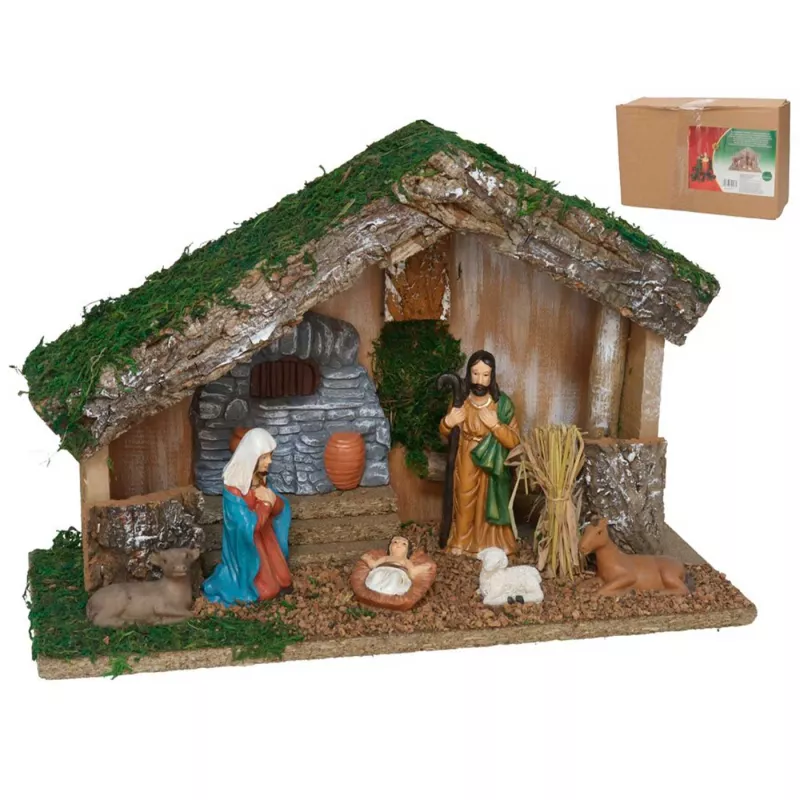 Descubre la magia de la Navidad con el Portal de nacimiento con 6 figuras Tradineur, una encantadora representación del nacimiento que incluye las figuras de San José, Virgen María, el Niño Jesús, la mula, el buey y una oveja. Esta pieza, elaborada en madera y resina, decorada con musgo, aporta un toque artístico y tradicional a tu decoración navideña, reuniendo la calidez y el espíritu de las fiestas en un diseño compacto y lleno de detalle.