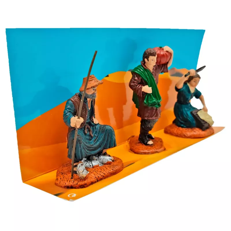 Completa la decoración de tu belén navideño con este encantador set de 3 figuras de campesinos, elaboradas en durexina, un material resistente y de alta calidad que garantiza durabilidad y detalles precisos. Cada figura mide aproximadamente 10 cm, ideal para integrarse perfectamente en tu nacimiento o pesebre.