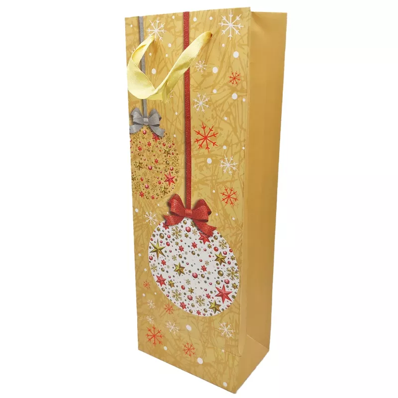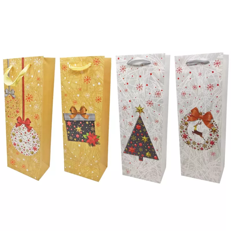 Con unas dimensiones de 36 x 12,7 x 8,2 cm, esta bolsa es ideal para botellas estándar de vino y champán. Su resistente cartón garantiza seguridad durante el transporte, mientras que las cómodas asas facilitan su manejo. Además, cada bolsa viene con un diseño navideño diferente, seleccionado de forma aleatoria, aportando un toque sorpresa y originalidad a cada compra.