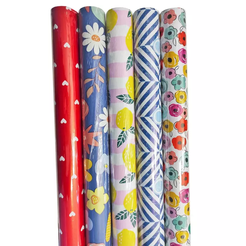 Este set incluye cinco rollos con diseños aleatorios cuidadosamente seleccionados para aportar variedad y estilo a tus regalos. El papel es resistente y fácil de manipular, asegurando un acabado profesional en cada paquete. Además, su diseño versátil y colorido se adapta a diferentes celebraciones, convirtiéndolo en una opción práctica y decorativa para tener siempre a mano.