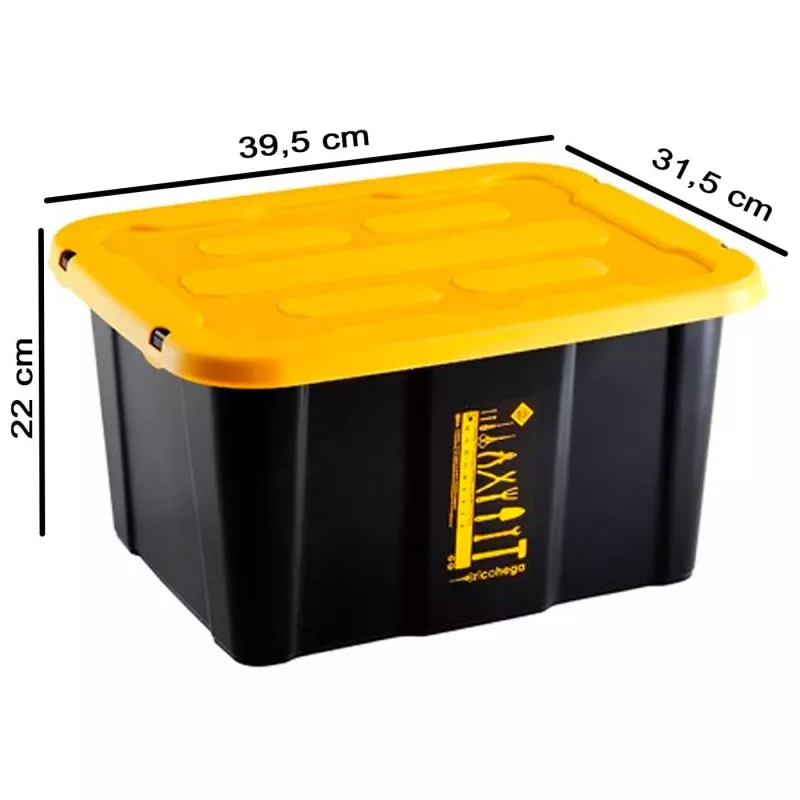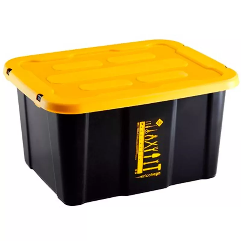 Si quieres tener todo tipo de objetos del hogar a buen recaudo y libres de polvo o suciedad, esta caja de almacenaje de 17 litros con tapa y diseño en colores negro y amarillo te será muy útil. Es perfecta para guardar en ella herramientas, juguetes, comida del perro, ropa, zapatos, productos de limpieza, y mucho más. La tapa se ajusta a la base mediante 4 clips de cierre, los cuales garantizan que la caja quede perfectamente cerrada, proporcionando también una mayor estabilidad. Se trata de una caja polivalente ideal para guardar en el sótano, oficina, despensa o garaje.