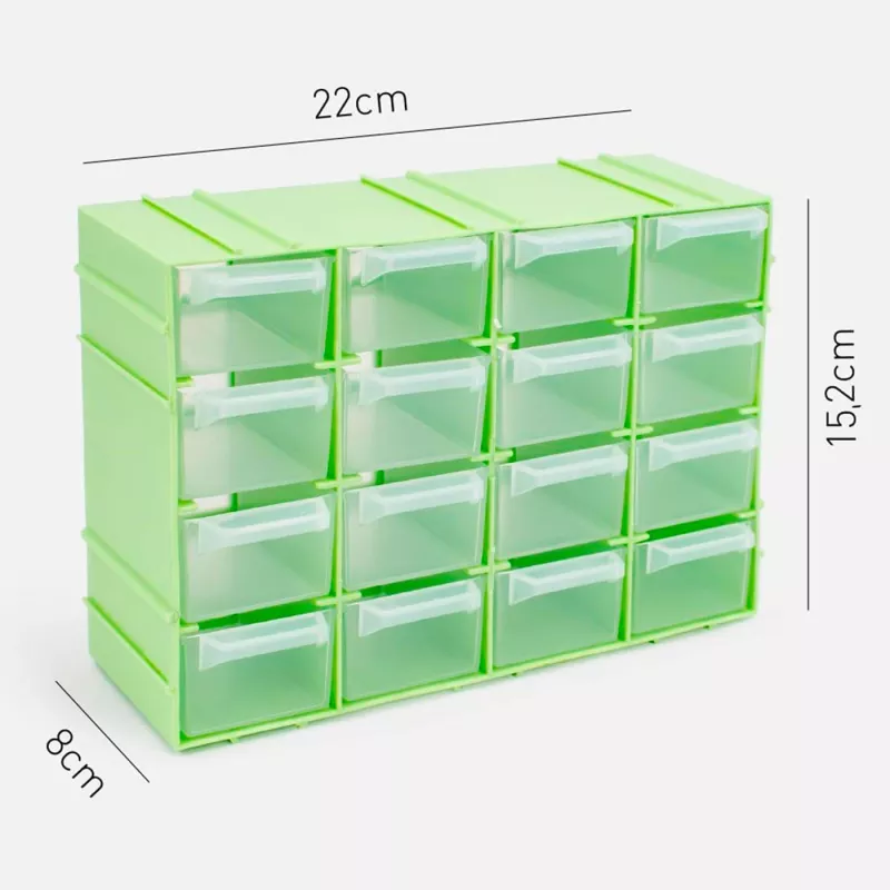 Descubre la solución perfecta para mantener el orden en tu espacio de trabajo o en tu hogar con nuestro organizador apilable multiusos. Con unas dimensiones totales de 15 x 22 x 8 cm (alto x ancho x profundo), este práctico organizador está fabricado en plástico de alta resistencia y cuenta con una elegante estructura de color verde.