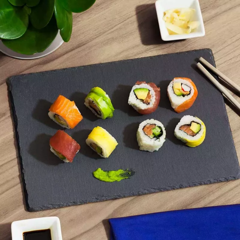 Es importante tener en cuenta que esta bandeja no es apta para lavavajillas, por lo que se recomienda el lavado manual para mantener su belleza y durabilidad a lo largo del tiempo. Sorprende a tus invitados con esta elegante bandeja de pizarra y eleva tus presentaciones a un nuevo nivel.