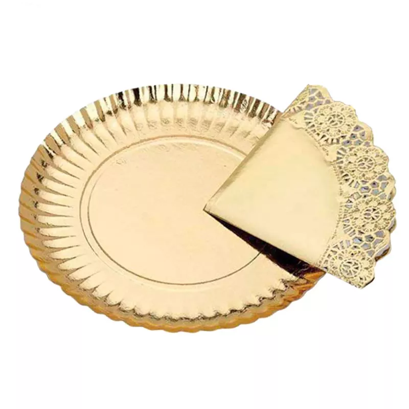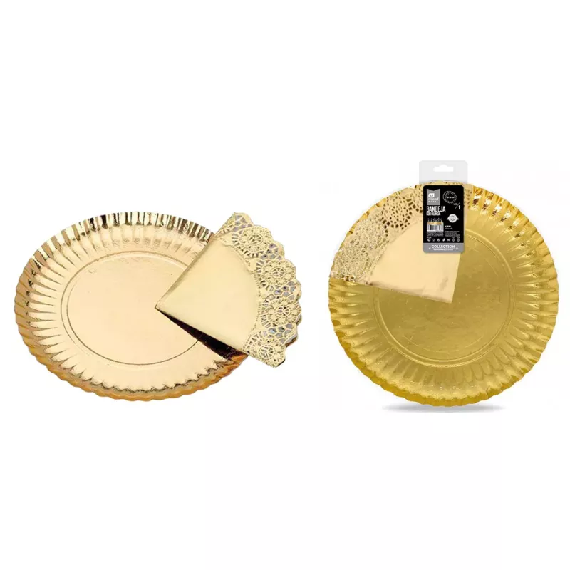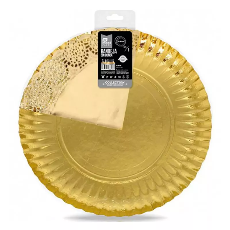 Descubre la elegancia y funcionalidad con nuestra bandeja de cartón dorada redonda de 38 cm de diámetro, diseñada especialmente para realzar la presentación de tus pasteles y postres en cualquier tipo de celebración. Este accesorio combina un acabado dorado brillante con un delicado encaje de papel tipo blonda, añadiendo un toque sofisticado y festivo a tu mesa.